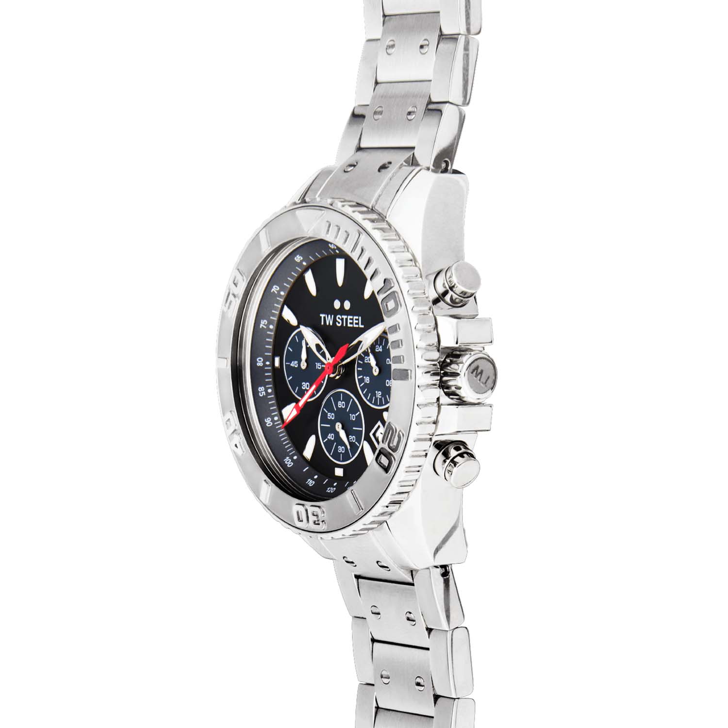 Deze TW steel uit de Vanceur Diver serie met nr TWVA5 wil je zeker in je collectie hebben. De TWVA5 valt op door zijn ronde stalen kast met gekartelde bezel met tachymeter en de schroefkroon. Het stoere horloge heeft een zwarte wijzerplaat met een datum en een chronograaf. De wijzers en uursaanduiding zijn ingelegd met lumibrite en de rode secondewijzer trekt extra de aandacht. Aan de stalen kast zit een opvallende stalen schakelband met vouwsluiting. Het horloge heeft wereldwijde garantie van 2 jaar en is 10ATM. Een casual model.