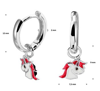 Zilveren oorringen met een unicorn bedel. Unicorn is met roze en wit emaille.
