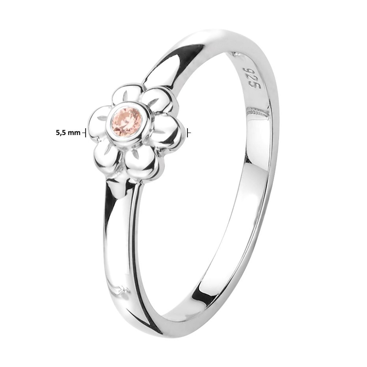 Gerhodineerd 925 zilveren ring uitgevoerd met een bloem en een schitterende roze zirkonia. De ring heeft een breedte van 5.5mm.